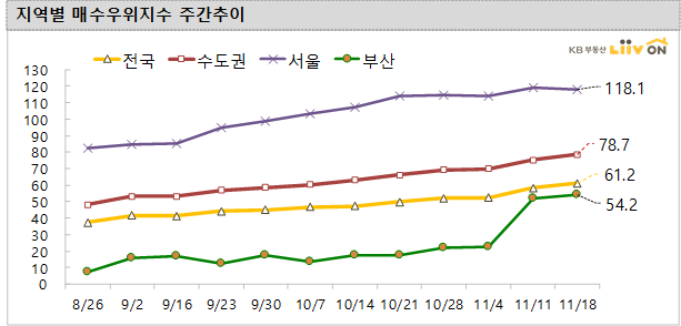 전국 매수우위 지수는 61.2를 기록해 전주 58.4 대비 상승하였습니다. 서울은 매수 지수가 소폭 하락하여 118.1을 기록하였지만 여전히 매도우위가 지속되고 있습니다.