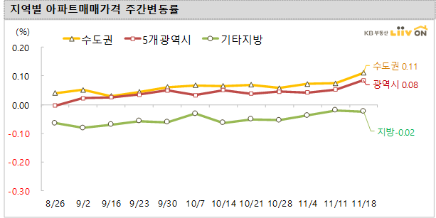 안녕하세요? 부자아빠의 부동산연구소입니다. 오늘은 KB부동산에서 발표한 11월 18일 기준 주간 아파트 가격동향입니다. 지난 한주가 지나고 어떤 변동이 있었는지 살펴보겠습니다.
