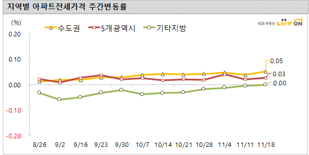 다음은 전국의 전세가격을 알아보겠습니다. 전세 가격 역시 매매 가격과 비슷하게 0.03% 상승하여 전국이 9주 연속 상승세가 지속되고 있습니다. 특히, 수도권과 5대 광역시는 상승을 이어갔고 지방은 보합을 보였습니다.