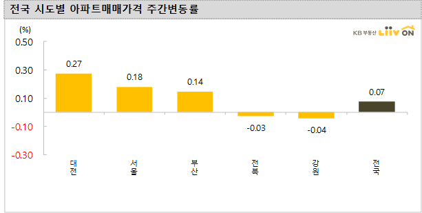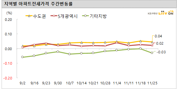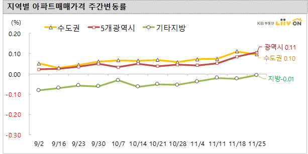 11월 25일 기준 전국아파트 매매가격은 전주대비 상승세를 이어가고 있습니다. 서울과 경기, 5개 광역시의 상승세는 지속되고 있고 반면에 기타 지방은 소폭 하락하는 모습이 지난주와 큰 차이가 없습니다.