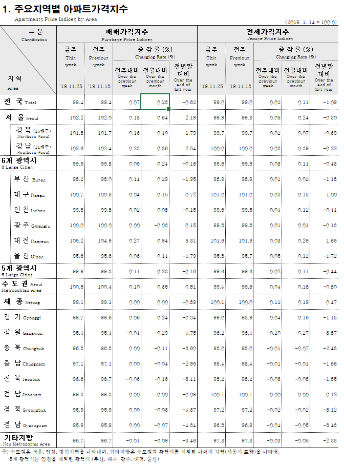 | 2019년 11월 25일 기준 주간아파트가격동향(한국감정원) (2) | 2019.12.02 |
