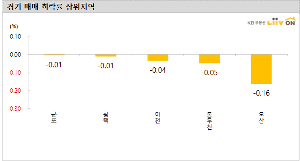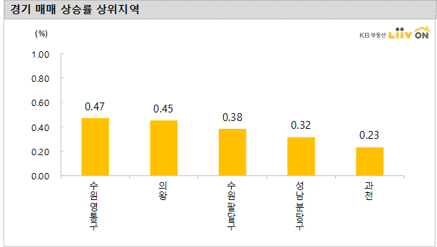 경기도와 인천은 지난주대비 상승률이 소폭 하락하였지만 상승세를 이어가고 있으며 수원과 의왕이 상승을 주도하고 있으며 오산, 동두천, 이천 등 외곽지역은 하락을 보였습니다.