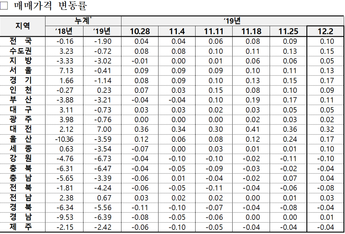 | 2019년 12월 9일 기준 주간아파트가격동향(한국감정원) (0) | 2019.12.15 |