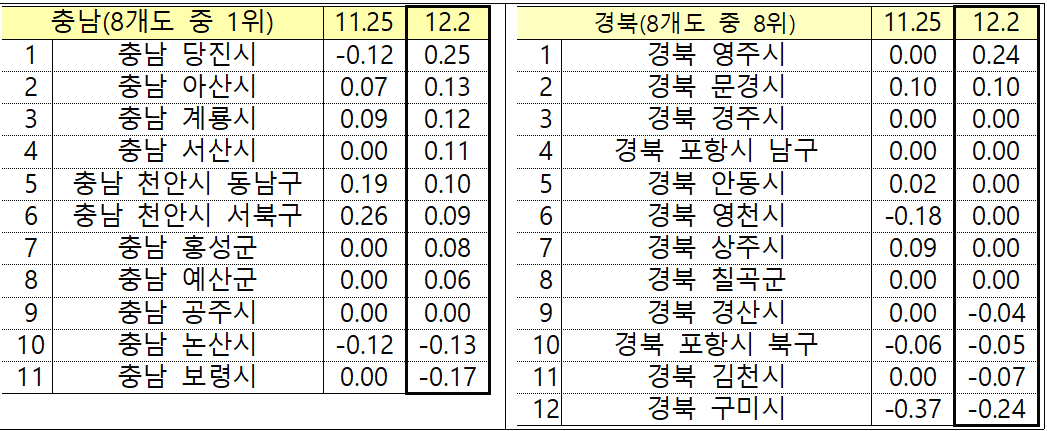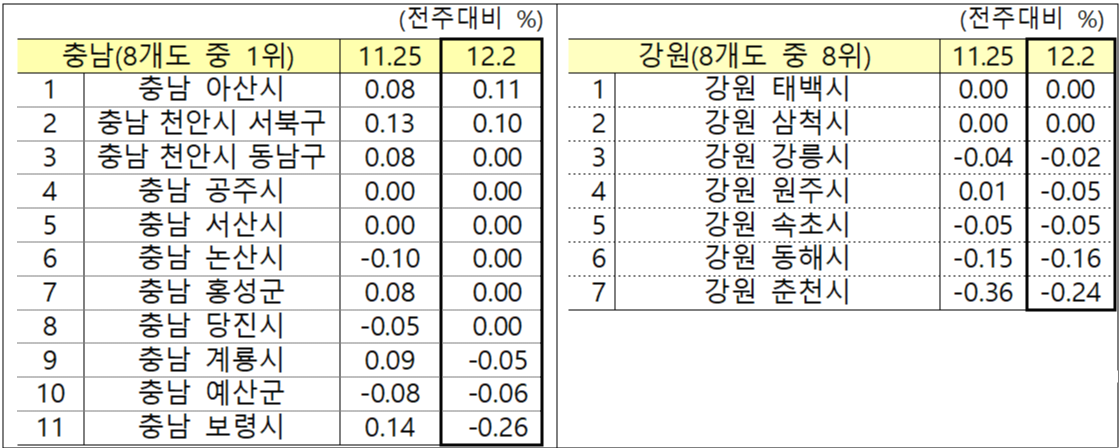 - 지방의 5대 광역시 중 대전은 0.18% 상승하였습니다. 전년대비 입주물량 감소한 유성구와 중구 태평동 일대, 서구 둔산동 일대 중심으로 상승하였습니다. 광주는 0.01% 소폭 상승한 모습입니다. 세종은 상승폭이 0.36%→0.29%로 축소되었지만 입주물량 소화로 인해 도담동 새롬동과 고운동 위주로 상승하였습니다. 8개도는 0% 보합에서 -0.01% 하락하였지만 지역마다 차이를 보이고 있습니다.