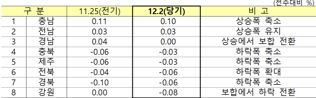 안녕하세요? 부자아빠의 부동산연구소입니다. 어제에 이어 오늘은 12월 2일 기준 한국감정원에서 발표한 주간 아파트 가격동향을 살펴보려고 합니다. 12월 2일 기준 이번 주 매매 가격은 0.10%, 전세 가격은 0.09% 상승하였습니다.