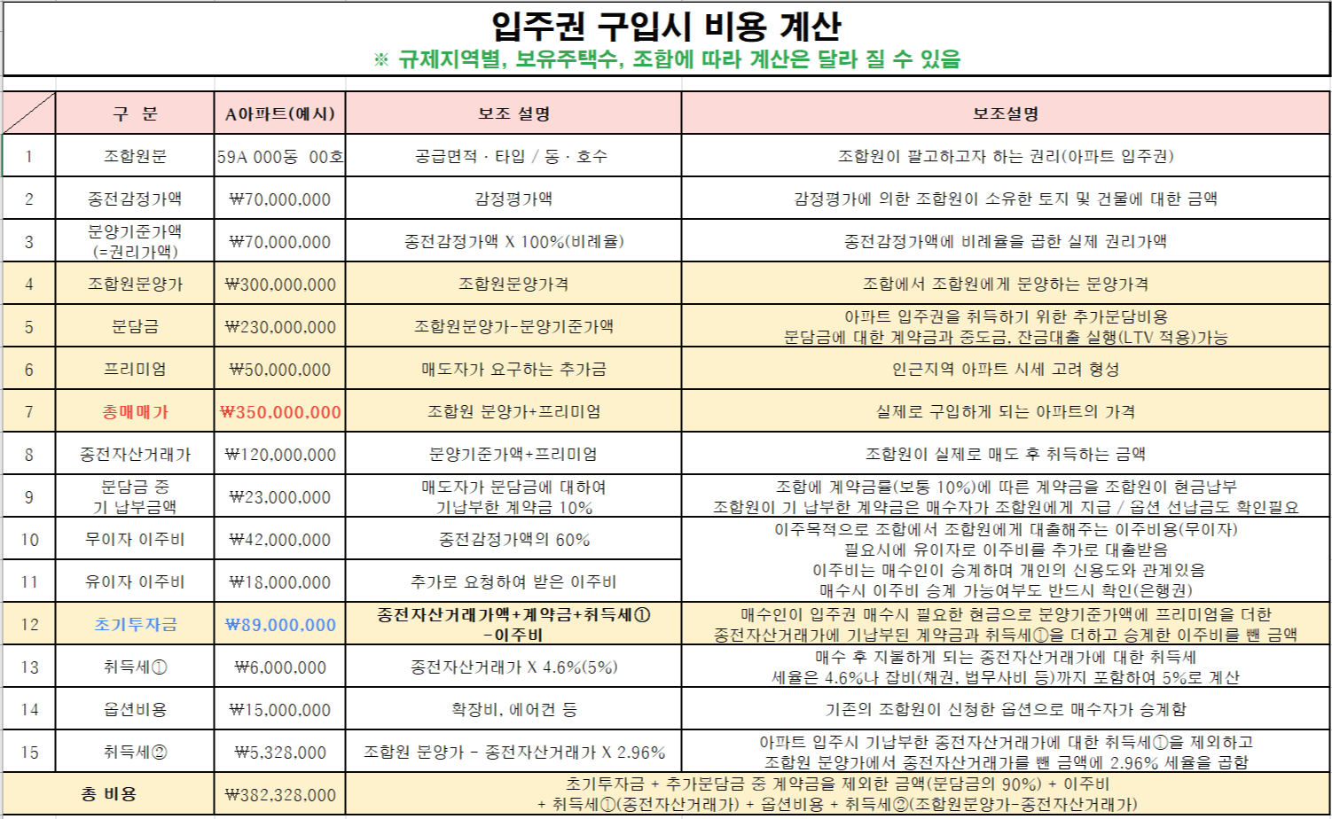 - 총 비용 : 초기투자금에 추가분담금 중 계약금(보통 10%)을 제외한 금액(보통 분담금의 90%)에 이주비와 취득세1(종전자산거래가), 옵션비용, 취득세2(조합원분양가에 종전자산거래가를 뺀금액)을 더한 금액