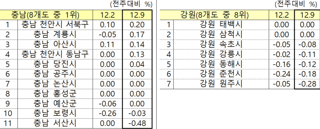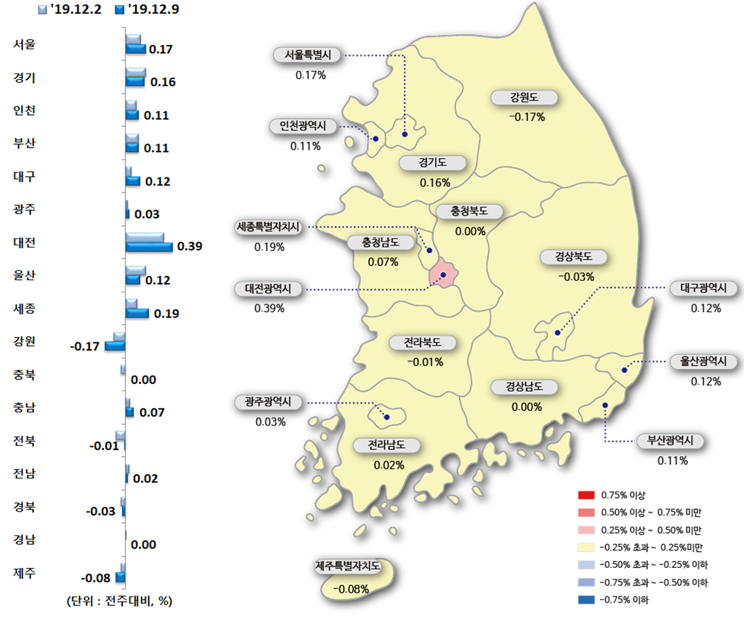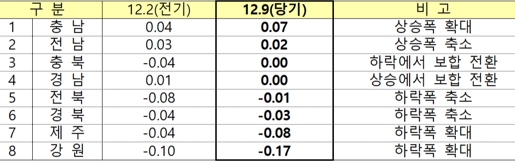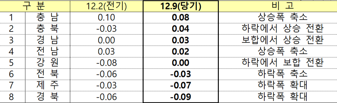 안녕하세요? 부자아빠의 부동산연구소입니다. 어제는 오늘에 이어 한국감정원에서 발표한 12월 9일 기준 주간 아파트 가격동향을 살펴보겠습니다.