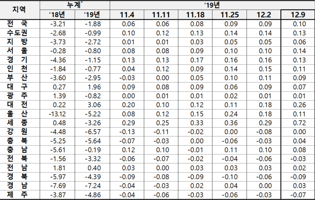 | 2019년 12월 2일 기준 주간아파트가격동향(한국감정원) (2) | 2019.12.08 |