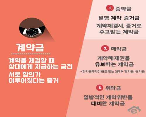 - 증약금 : 계약금은 계약체결의 증거로서의 의미를 가지는데, 이를 증약금이라 합니다. 그래서 계약금은 언제나 증약금으로서의 성질을 가집니다.