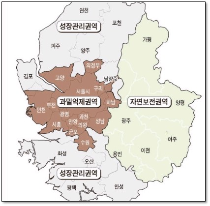 1. 과밀억제권역: 인구와 산업이 지나치게 집중되었거나 집중될 우려가 있어 이전하거나 정비할 필요가 있는 지역