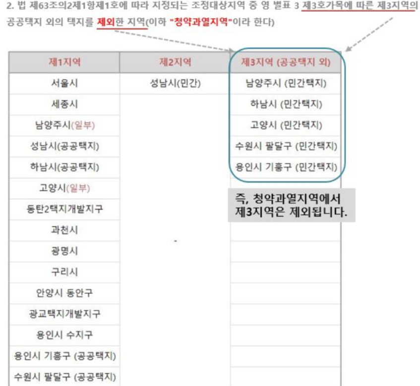 세 번째로 청약과열지역은 조정대상 지역 중 아래의 지역들이 해당되는데요, 제3 지역인 남양주, 하남, 고양, 수원시 팔달구, 용인시 기흥구의 민간택지는 청약과열지역에서 제외됩니다. 이전에 작성한 전매제한 설정기준에서 관련 내용을 언급한 적이 있었는데요, 공공택지냐 민간택지냐에 따라 같은 지역임에도 전매기간이 달랐던 것을 알 수 있습니다.