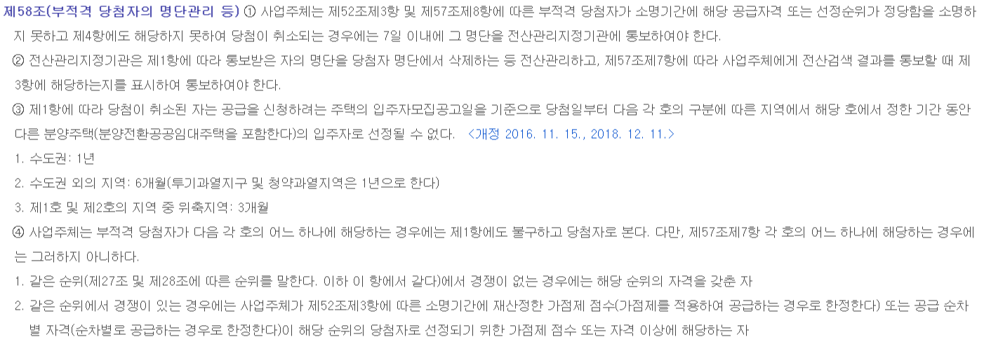 청약 부적격자로 당첨이 취소된 경우에는 당첨일로부터 1년 동안 다른 분양주택(분양전환 공공임대주택을 포함)의 입주자로 선정될 수 없습니다. 즉, 1년간은 청약이 불가능합니다. 자세한 내용은 주택공급에 관한 규칙 제58조에 나와있습니다. 아래 사진을 참고하시기 바랍니다.