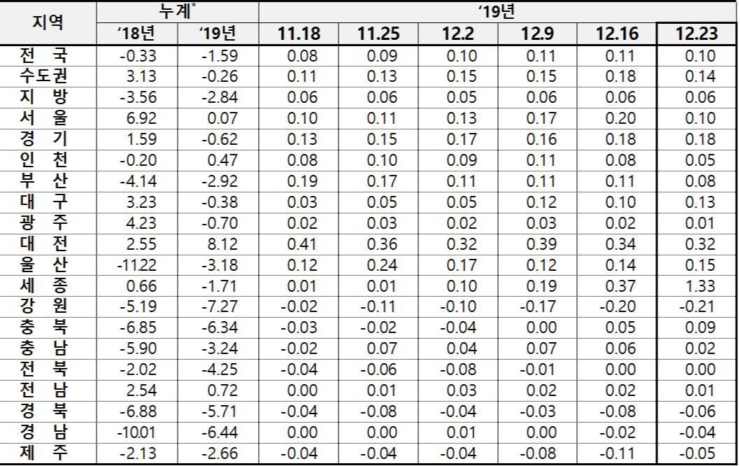 | 2019년 12월 16일 기준 주간아파트가격동향(한국감정원) (2) | 2019.12.22 |