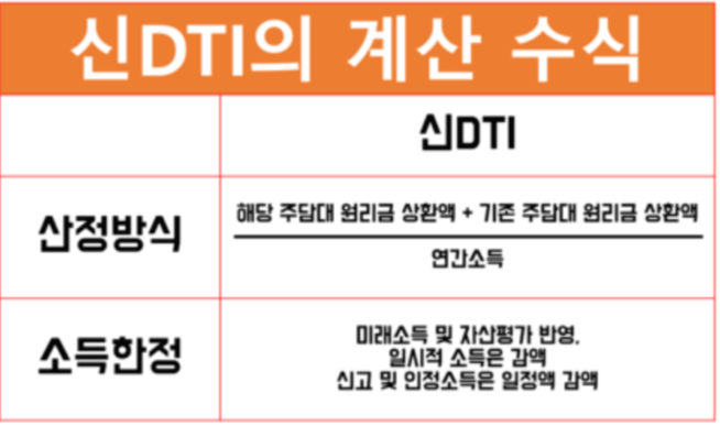 * DTI는 현재 신 DTI를 적용중에 있습니다. 82 부동산 대책 이후 2018년 1월 31일부터 적용하고 있습니다. 신 DTI의 경우 소득 정보를 주기적으로 반영하고 미래의 소득 증가 및 감소까지 고려하는데, 정년이 임박한 경우에는 신 DTI가 적용되어 대출받는데 상당한 어려움을 겪게 됩니다. 또한, 2년치 소득을 증빙해야 하고 두 번째 대출의 경우 30년 만기가 아닌 15년 만기로 짧아지게 되므로 DTI 비율에 대한 부담이 커졌습니다.