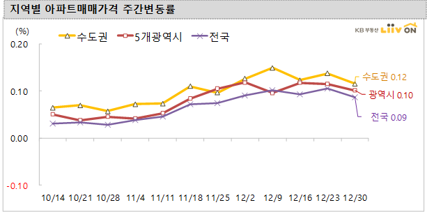 12월 30일 기준 전국 아파트 매매 가격 변동률은 전주 대비 상승(0.09%)을 기록했습니다. 서울(0.17%)과 경기(0.10%)는 상승했고, 인천을 제외한 5개 광역시(0.10%)는 대전(0.41%)과 울산(0.06%), 대구(0.05%), 부산(0.04%), 광주(0.03%) 모두 상승했습니다. 기타 지방(0.01%)은 전주대비 소폭 상승을 기록했습니다. 세종(0.09%), 전남(0.06%), 경남(0.03%), 충남(0.02%)은 상승했고, 강원(-0.11%), 경북(-0.01%)은 하락했으며, 충북과 전북은 보합(0.00%)을 나타냈습니다.