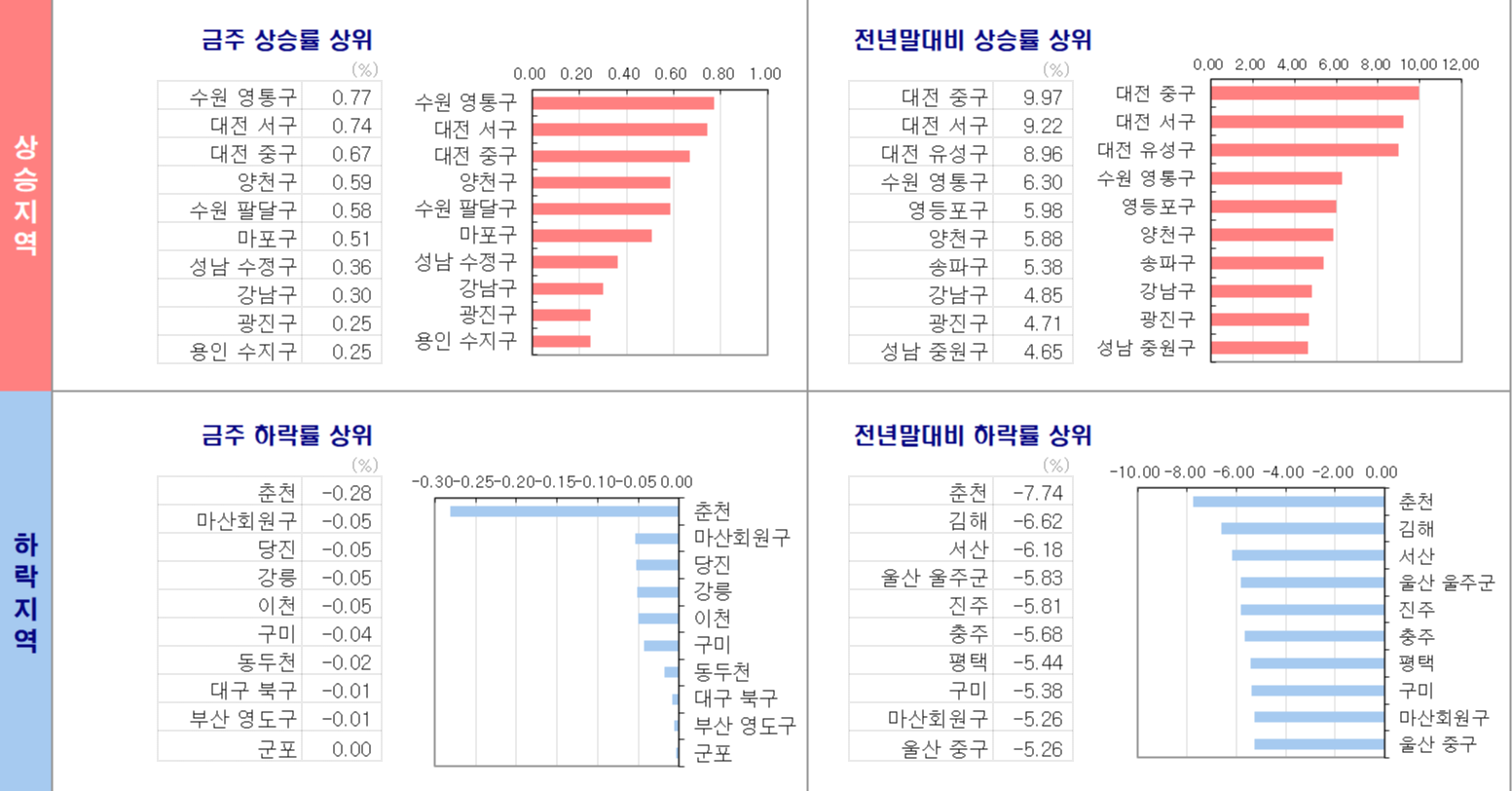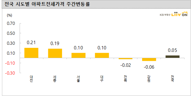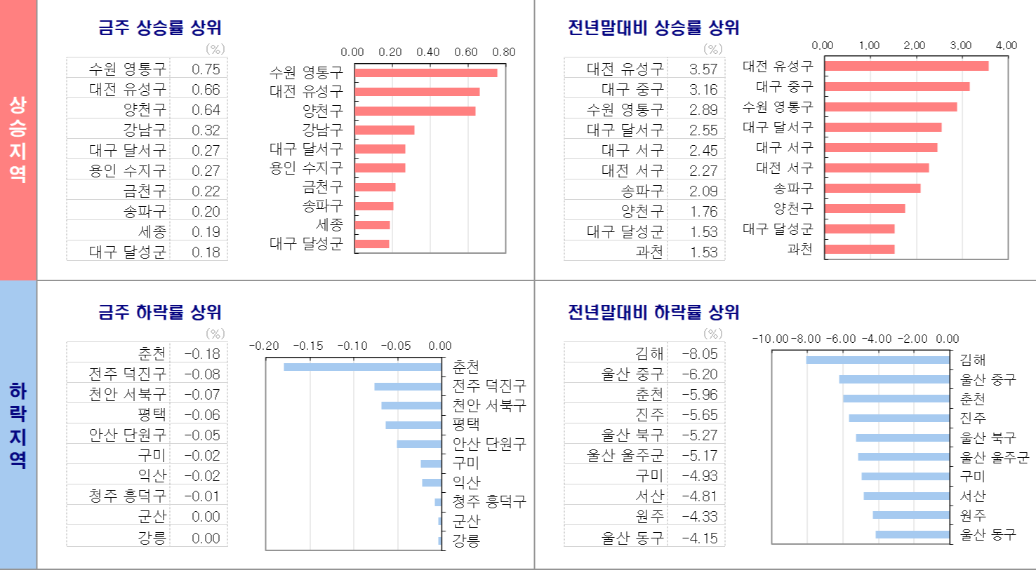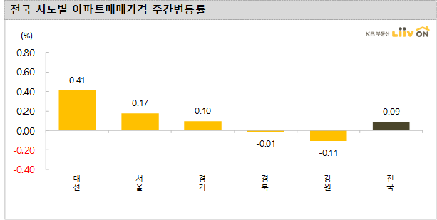 서울은 전주 대비 0.10%를 기록, 경기(0.06%)는 소폭 상승했다. 5개 광역시는 대전(0.21%)과 대구(0.10%), 울산(0.04%)은 상승했고, 부산과 광주는 보합(0.00%)을 기록했다.
