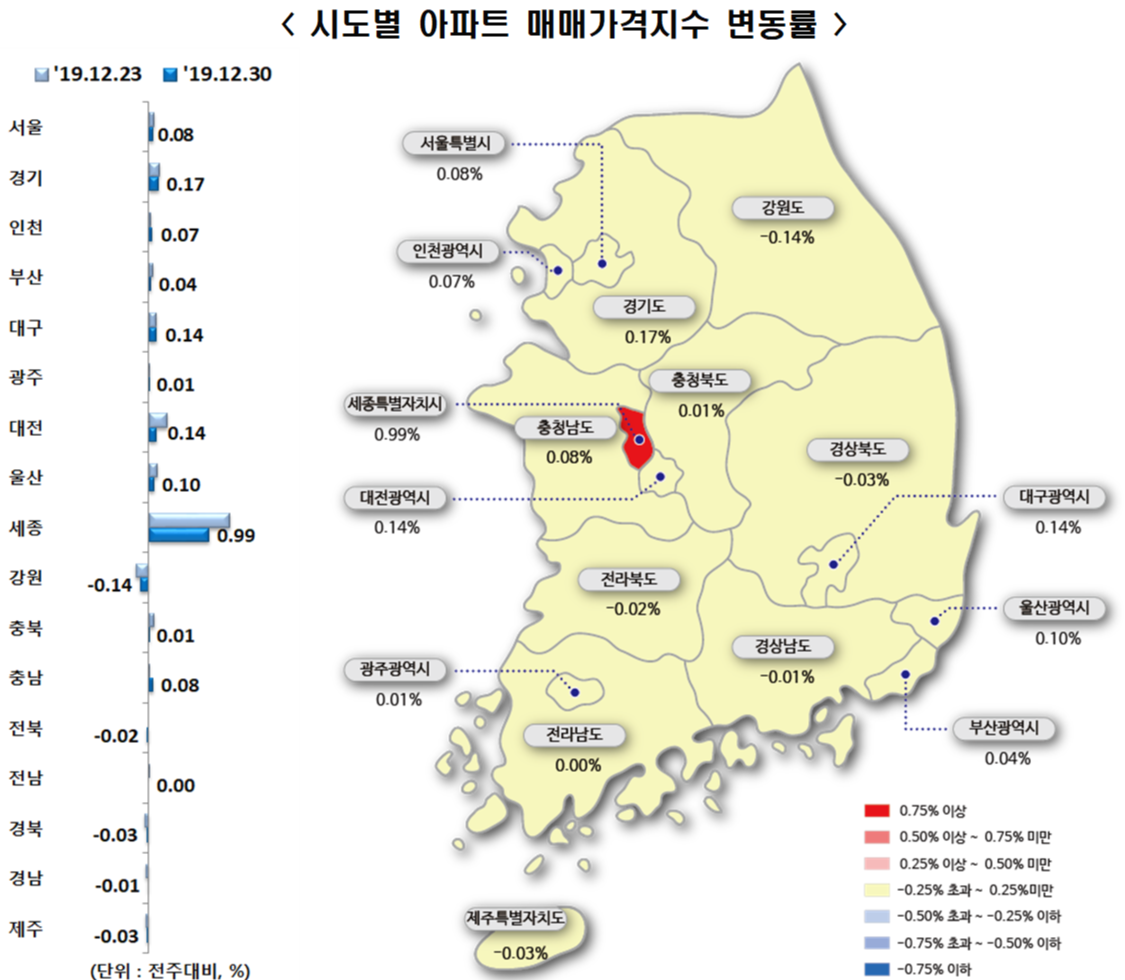- 세종(1.33%->0.99%)도 상승폭은 축소되었지만 2020년도 공급물량 감소와 가격 상승 기대감으로 상승세는 이어지는 모습입니다.