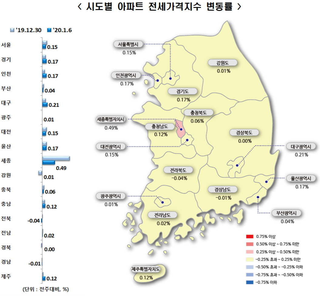 - 세종(1.09%->0.49%)도 상승폭은 축소되었지만 2020년도 공급물량 감소와 매물 부족 현상이 지속되고 있습니다. 특히, 정부청사 인근에 새롬 및 도담동, 소람 보람동 등 대부분의 지역의 상승세가 이어졌지만 급등 피로감에 상승폭은 축소된 모습입니다.