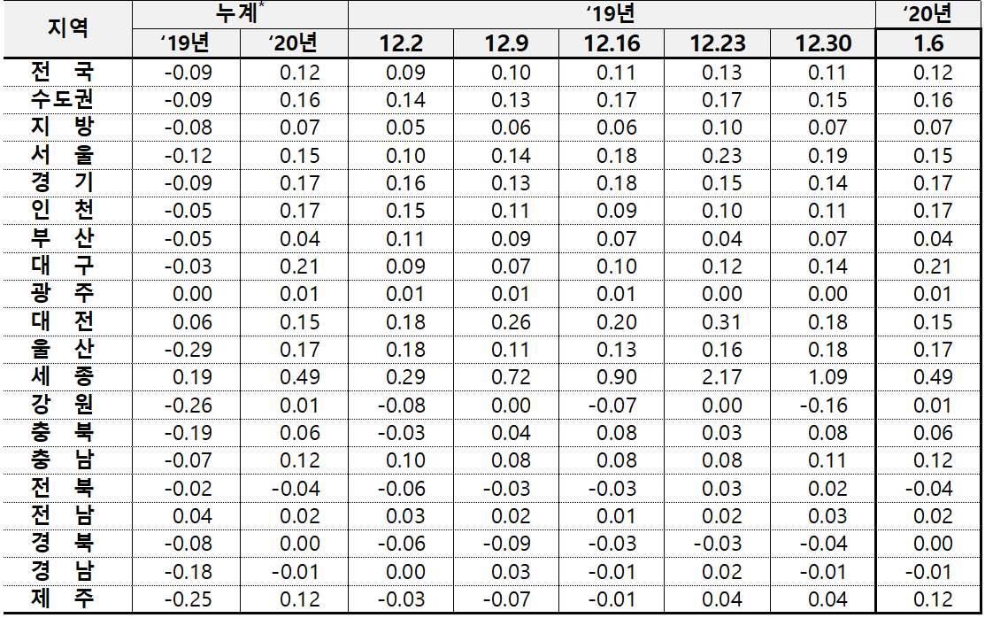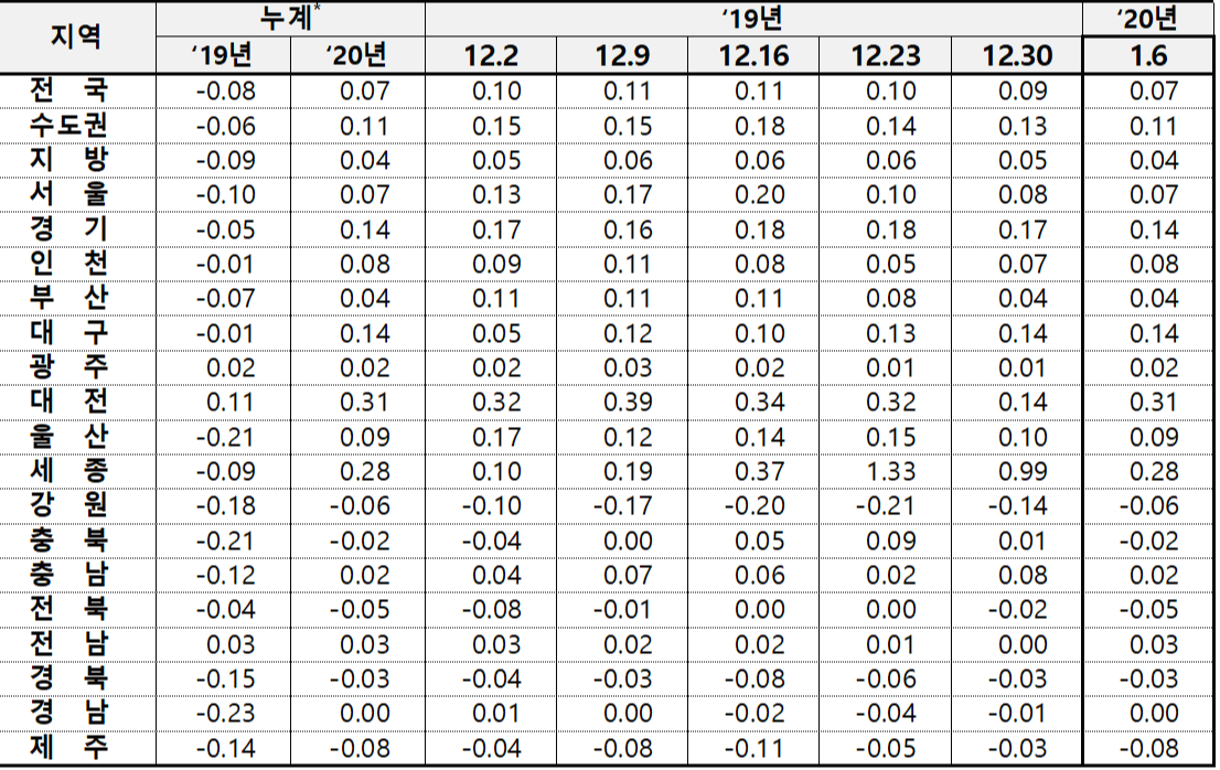 안녕하세요? 부자아빠의 부동산연구소입니다. 어제에 이어 오늘은 한국감정원에서 발표한 1월 6일 기준 주간 아파트 가격동향을 살펴보겠습니다. 새해 첫 번째 발표자료라 어떤 시장의 반응이 나왔을지? 궁금합니다.