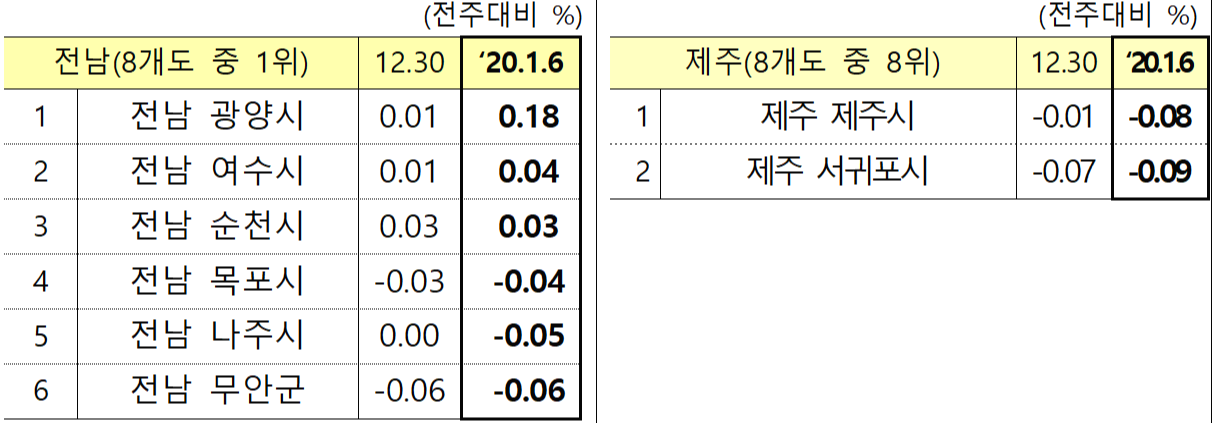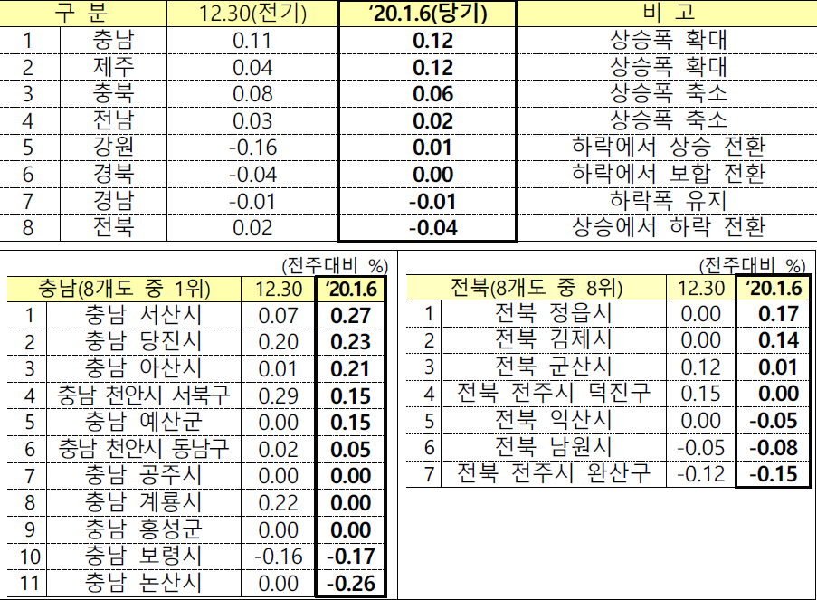 - 세종(0.99%->0.28%)도 상승폭은 축소되었지만 2020년도 공급물량 감소와 가격 상승 기대감으로 상승세는 이어지는 모습입니다. 단기 급등에 피로감과 호가로 상승세가 축소된 모습입니다.