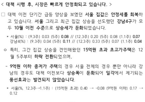 위에 내용들은 발표문의 내용을 일부 발췌한 것 입니다. 실제로 위에서 발표한 내용대로 1216 부동산 안정화 방안 이후에 서울의 고가주택 위주로 관망세가 나타나면서 정부의 발표 안처럼 가격이 떨어졌습니다. 그렇지만 우리는 데이터의 왜곡을 너무나 잘 알고 있으며 데이터만으로는 논리가 약하다는 것을 너무나 잘 알고 있습니다.