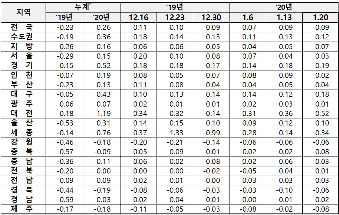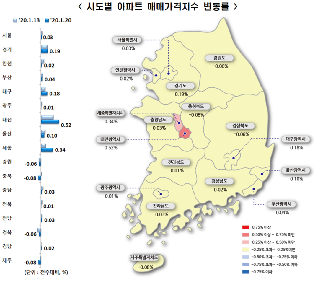 안녕하세요? 부자아빠의 부동산연구소입니다. 어제에 이어 오늘은 한국감정원에서 발표한 1월 20일 기준 주간 아파트 가격동향을 살펴보겠습니다.