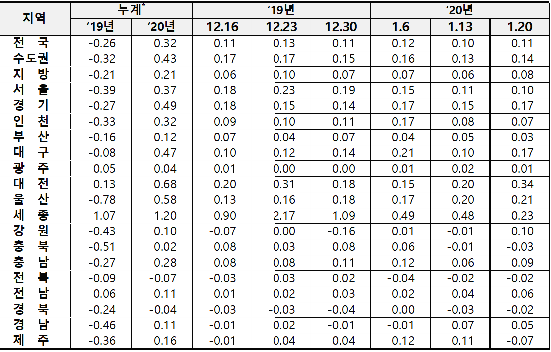 | 2020년 1월 13일 기준 주간아파트가격동향(한국감정원) (2) | 2020.01.19 |