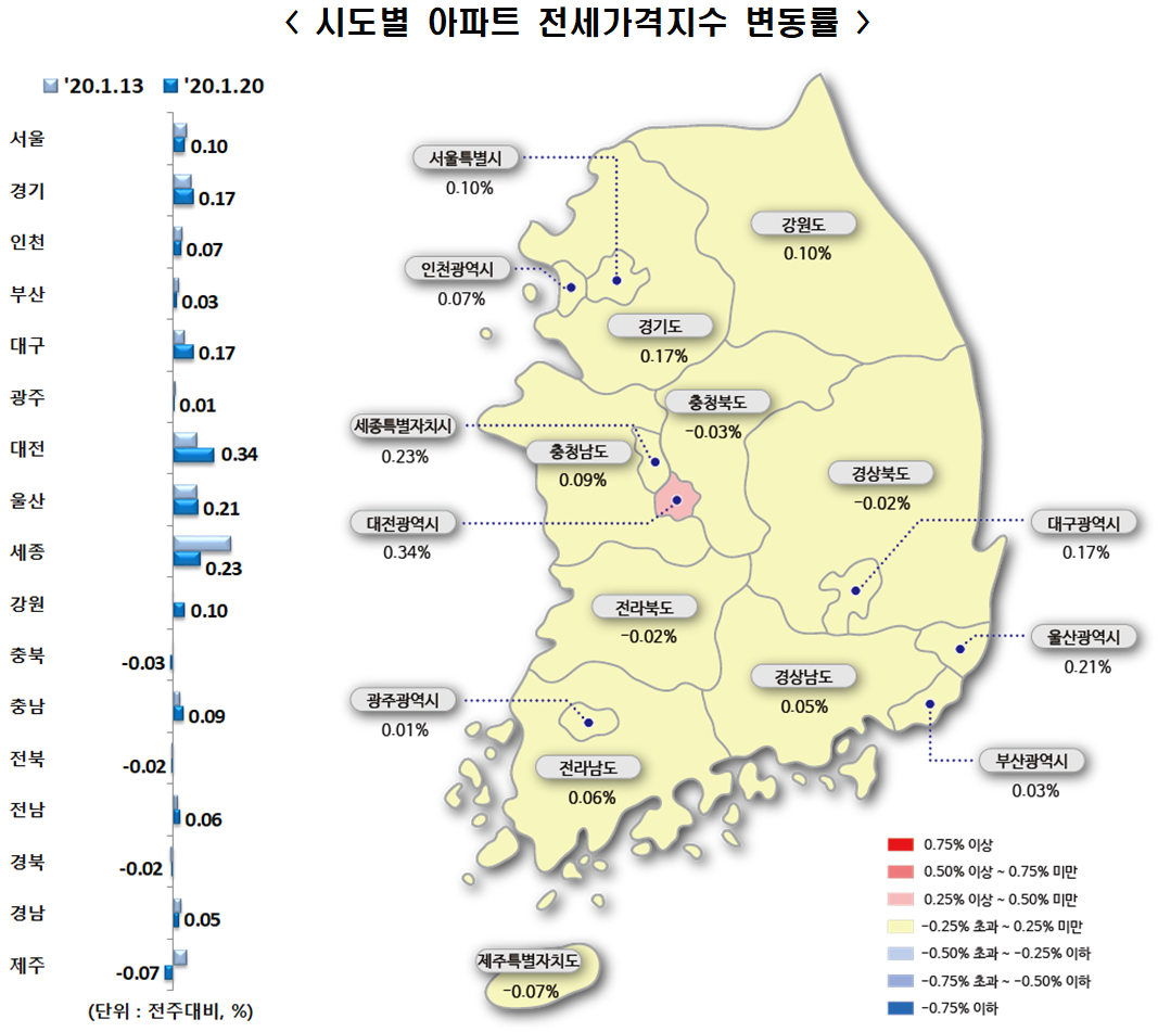- 세종(0.14%->0.34%)도 상승폭이 확대되었습니다. 행복도시 내 BRT노선 인근 등 입지여건이 양호한 새롬 및 다정동, 소담동 등 전 지역에서 상승세가 이어지고 있습니다. 매주 상승폭은 다르지만 외지인 투자도 증가하며 상승세가 이어지는 모습입니다.