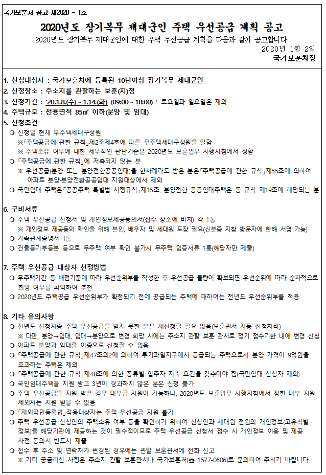 - 보훈(지)청에 등록된 10년이상 장기복무 제대군인으로서 신청일 현재 무주택 세대구성원