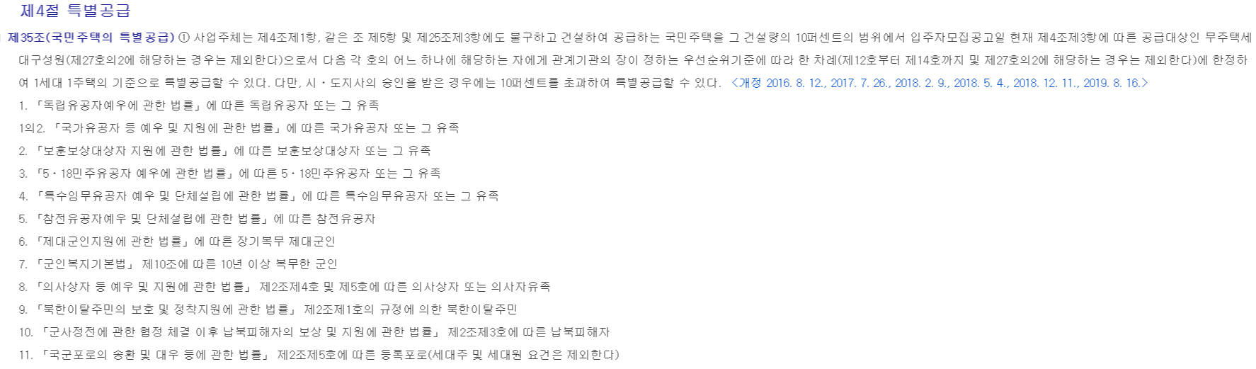 특별공급에는 우리가 아는 신혼부부나 노부모봉양, 생애최초 특별공급 뿐만 아니라 국민주택(85㎡이하,34평형)규모 이하의 주택중 민간 및 공공분양의 약 10% 범위 내에서 공급하는 국민주택 특별공급이 있는데, 장기복무제대군인 특별공급은 '제대군인지원에 관한 법률'에 따라서 10년이상 근무하고 제대한 군인에게 공급하고 있습니다..