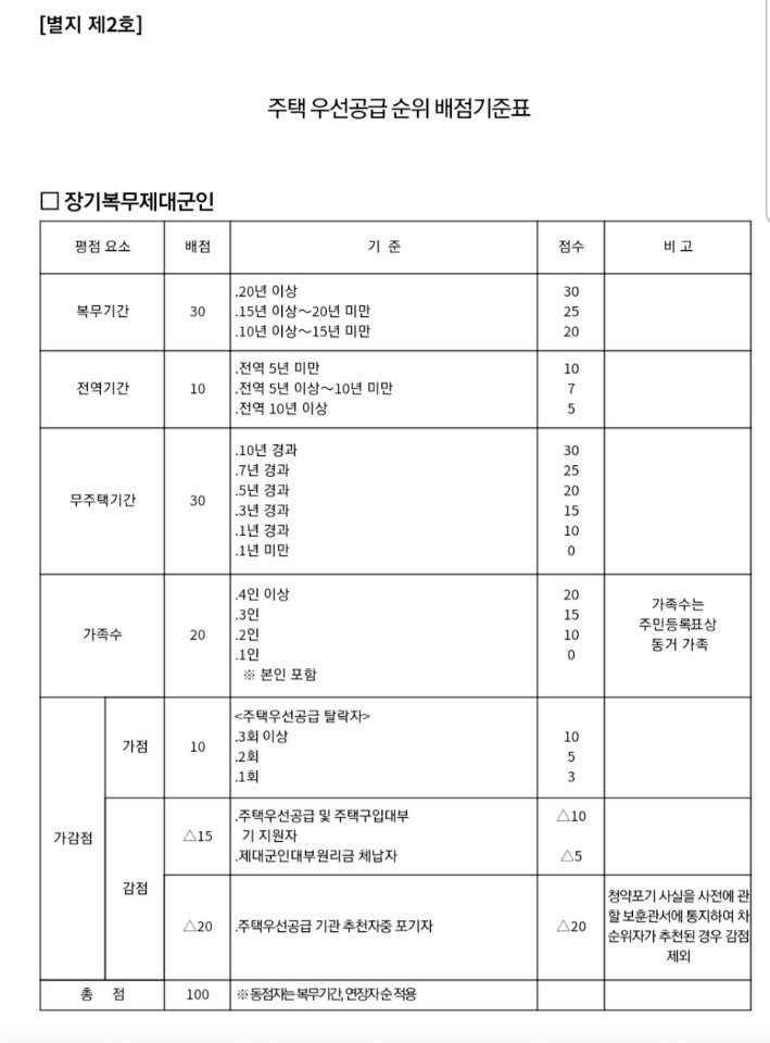 - 우선순위 결정 및 통지 : 복무기간, 전역기간, 무주택기간, 가족수 등 배점기준에 의거 개인별 통지