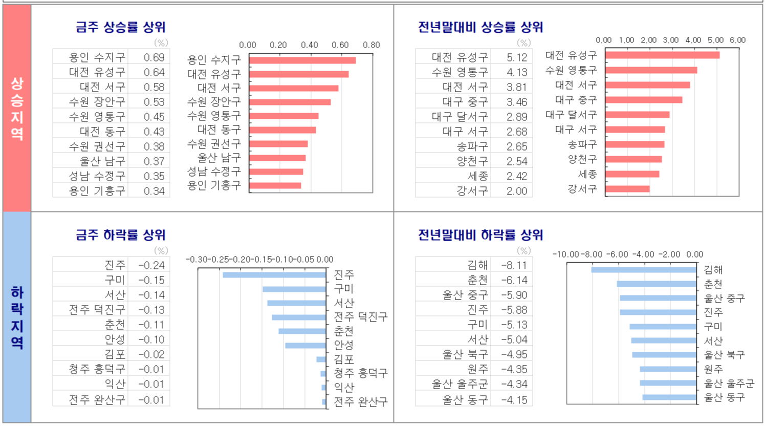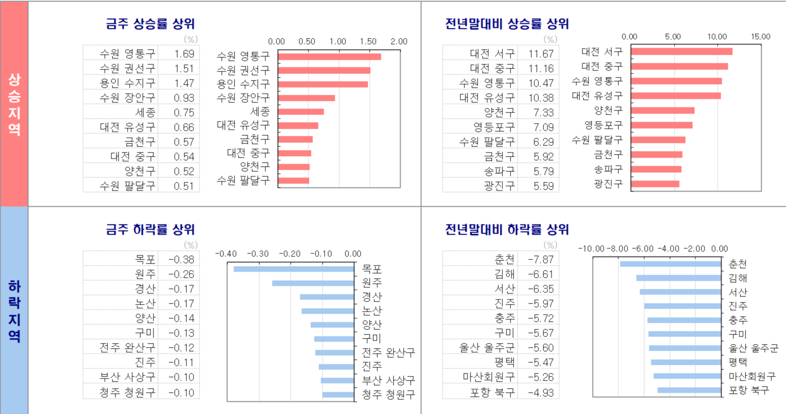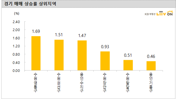 - 경기는 수원과 용인, 성남을 중심으로 상승을 이어오며 2주전 대비 0.34%로 주간 평균 0.17% 변동률을 기록했습니다. 2주간 상승률이 상대적으로 높은 지역은 수원 영통구(1.69%), 수원 권선구(1.51%), 용인 수지구(1.47%), 수원 장안구(0.93%) 입니다.
