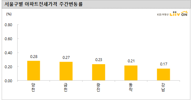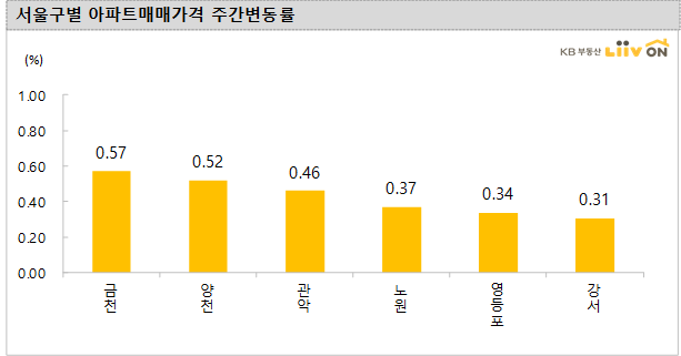 2주간 상승률이 상대적으로 높은 구는 금천구(0.57%), 양천구(0.52%), 관악구(0.46%), 노원구(0.37%) 순으로 다른 구에 비해 상승폭이 높았습니다.