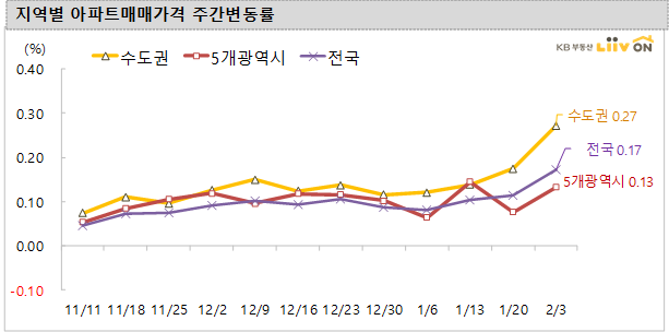 2월 3일 기준 전국 아파트 매매가격 변동률은 2주전 대비 상승(0.17%)(주간 평균 0.085%)을 기록했습니다. 서울(0.22%)과 경기(0.34%)는 상승했고, 인천을 제외한 5개 광역시(0.13%)는 대전(0.45%)과 울산(0.21%), 대구(0.08%), 부산(0.04%), 광주(0.02%)는 전주대비 상승했습니다.