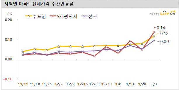 전국 아파트 전세가격은 2주전 대비 0.09% 주간 평균 0.045% 상승을 기록으며, 2주전 대비해서 수도권(0.12%)과 5개 광역시(0.14%)는 상승했고, 기타 지방(0.00%)은 보합을 나타냈습니다.