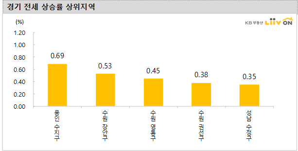 - 경기도 아파트 전세가격 변동률은 2주전 대비 0.14%로 주간 평균 0.07% 상승했습니다. 2주전 대비하여 용인 수지구(0.69%), 수원 장안구(0.53%), 수원 영통구(0.45%), 수원 권선구(0.38%) 등 상승을 나타냈고, 안성(-0.10%)과 김포(-0.02%)만 하락했습니다.