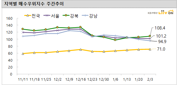 전국 매수우위지수는 71.0을 기록해 전주(70.3) 대비 소폭 상승했습니다. 서울은 101.2로 전주(102.3)대비 소폭 하락하였는데, 부동산 대책 규제 및 설 연휴 기간을 지나면서 거래시장은 냉각되었으며 계속 지켜보는 분위기 같습니다.