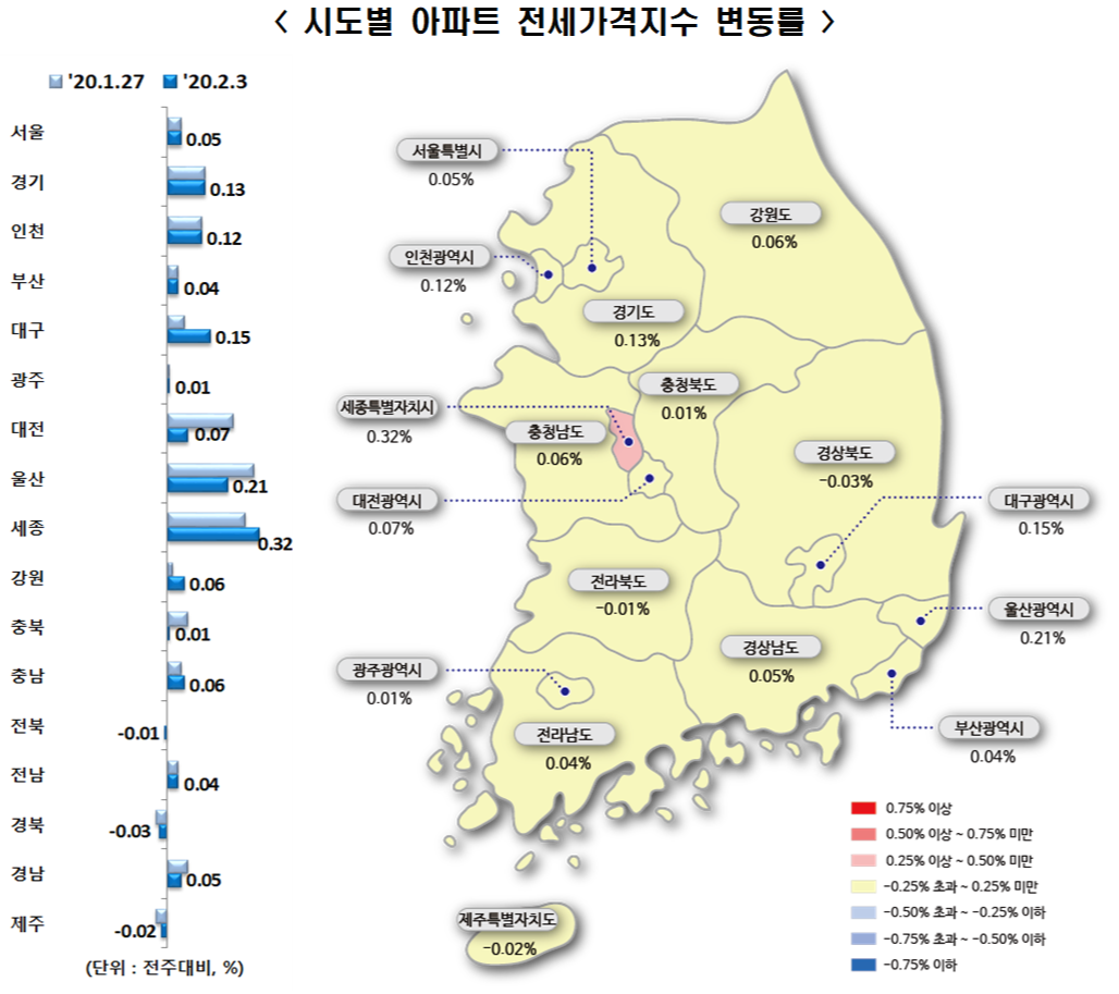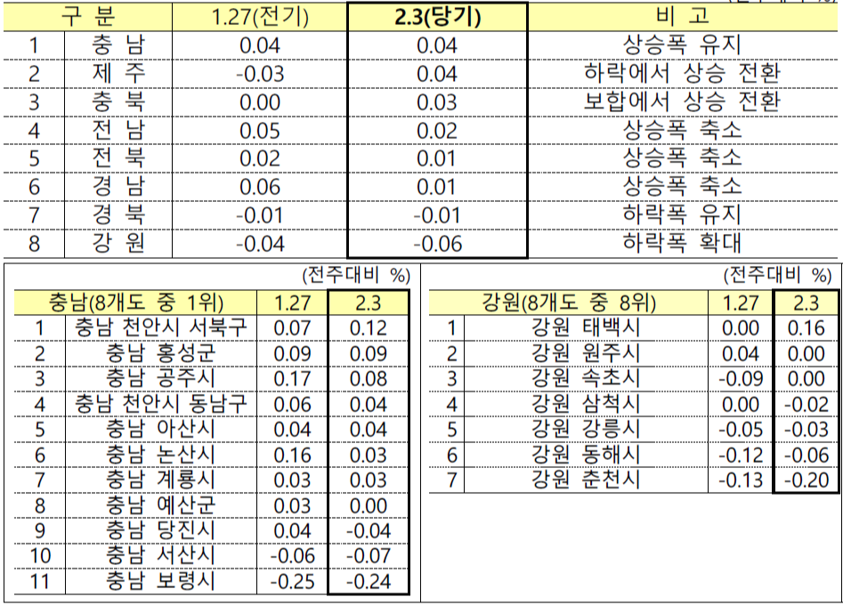 - 그 외 8개도(0.02%->0.01%)로 상승폭이 축소되었습니다. 특별한 점은 제주가 35주만에 0.04로 상승전환하였습니다.