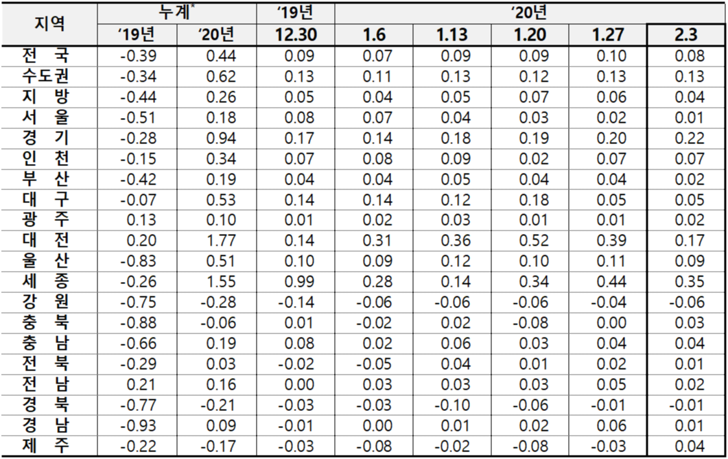 안녕하세요? 부자아빠의 부동산연구소입니다. 오늘은 한국감정원에서 발표한 2월 3일 기준 주간 아파트가격동향을 살펴보겠습니다.