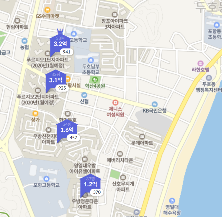 (3) 학군 : 인근 두호남초, 두호고, 포항고 등과, 작은 학원가가 형성되어 있네요,