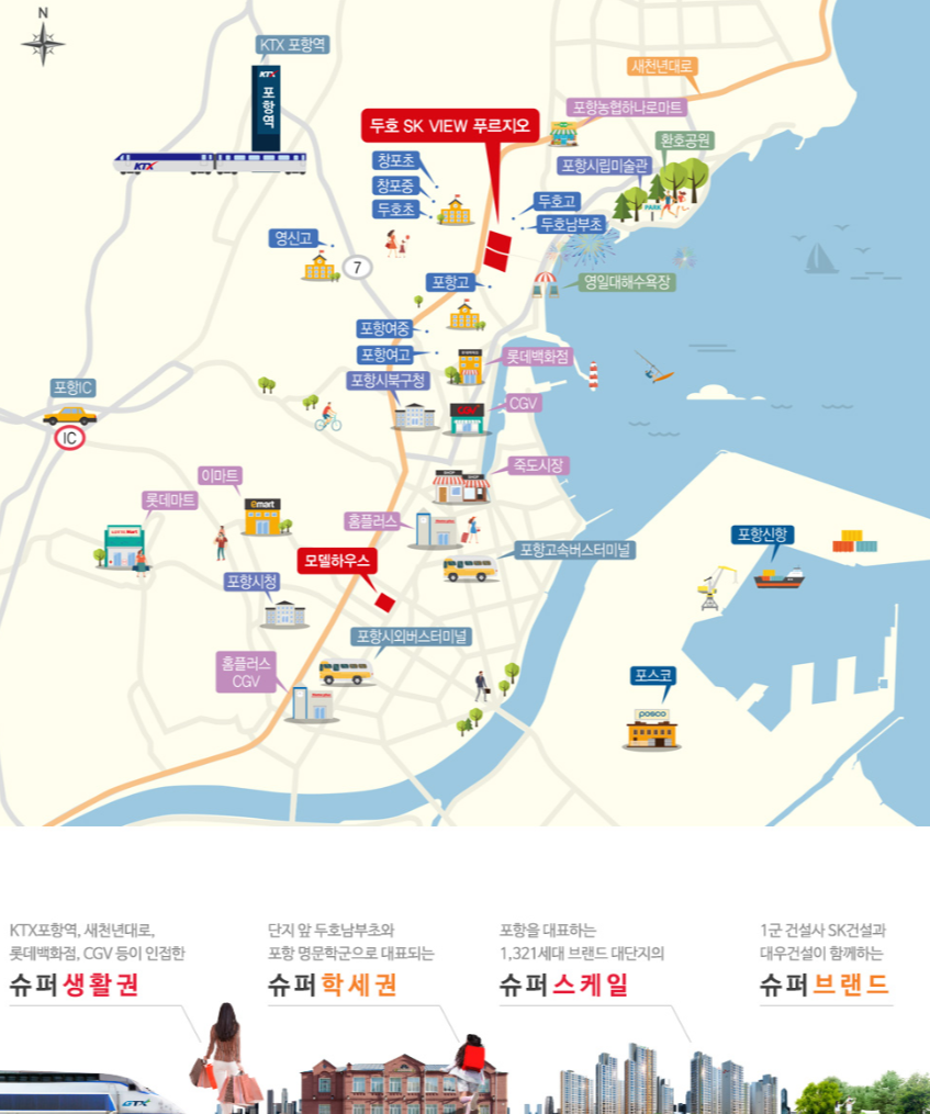 (1) 입지 : 특이하게 이번에 분양하는 두호 SK뷰 푸르지오는 17년 분양한 물량 외에 추가로 분양하는 것으로, 당첨 후 올해 입주해야 합니다. 현재 포항 북구내에서는 가장 대장아파트가 될 것 같습니다