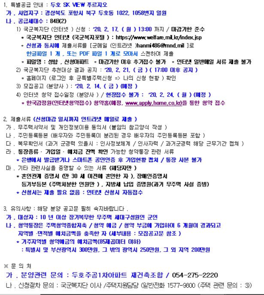 (2) 특별공급요건 : 10년이상 장기복무 무주택 세대구성원 및 군인 / 청약 6개월 경과 / 지역, 면적 예치금충족(경북 포항 200만원)