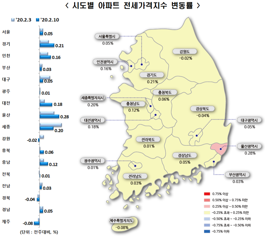 전국 주간 아파트 전세 가격은 지난주 대비 상승폭을 확대되었습니다. 수도권(0.10%->0.15%)은 상승폭 확대, 서울(0.05%->0.05%) 및 지방(0.06%->0.06%)은 상승폭 유지되었고 지방의 경우 5대 광역시(0.09%->0.08%, 세종(0.32%->0.20%), 8개도(0.02%->0.03%)가 되었습니다.