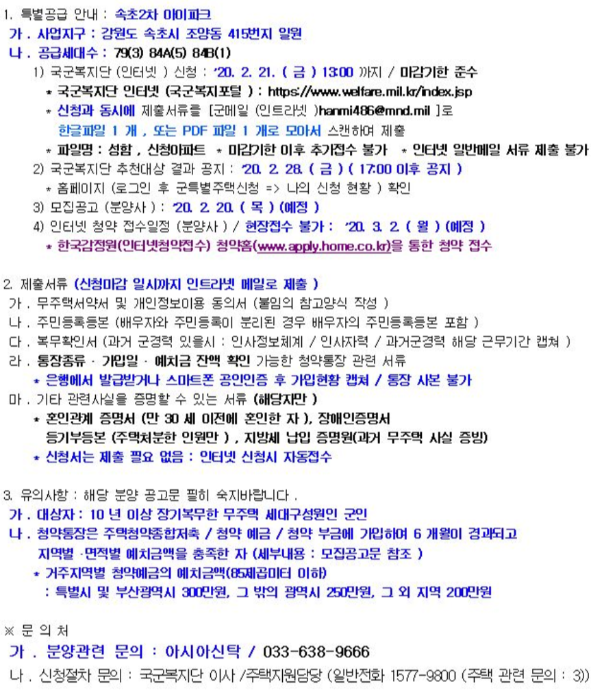(2) 특별공급요건 : 10년이상 장기복무 무주택 세대구성원 및 군인 / 청약 6개월 경과 / 지역, 면적 예치금충족(강원 속초 200만원)