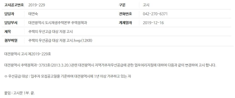 한예로, 아래는 최근 대전광역시청에서 고시한 우선공급거주요건 변경건인데요, 기존 3개월에서 1년으로 변경하였습니다. 2020년부터 분양하는 아파트는 1년의 거주요건이 적용된다고하는데, 갑작스레 바뀌면 내집마련 플랜을 세웠던 분들은 조금 답답하실 것 같습니다.