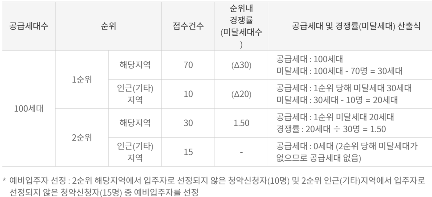 아래의 표를 보면 조금 이해는 쉬우실건데요, 1순위가 완판이라면 같은 1순위더라도 인근기타지역 청약자들에게는 기회가 가지 않고 해당지역분들이 모두 가져가겠지만, 미달날 경우에는 인근지역에게 기회가 가는 것입니다.