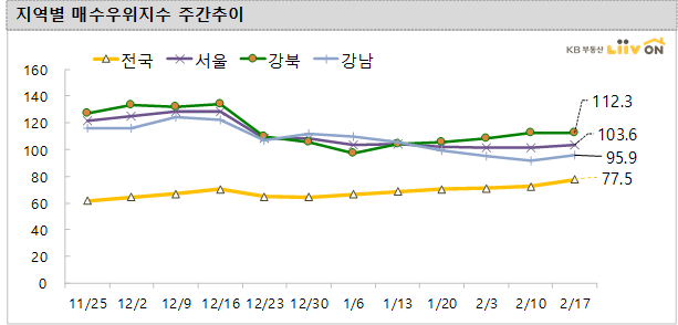 전국 매수우위지수는 77.5를 기록해 전주(72.4) 대비 소폭 상승했습니다. 서울은 103.6으로 전주(101.5)보다 소폭 상승했는데, 강남지역은 전주 91.7에서 95.9로 상승했지만 여전히 매수문의가 드물고, 강북지역의 매수문의는 미미하게 하락하였습니다.