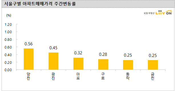 - 서울 아파트 매매가격은 전주 대비 0.17%로 지난주 변동과 유사한 수준을 보이고 있습니다. 주간 상승률이 상대적으로 높은 구는 양천구(0.56%), 광진구(0.45%), 마포구(0.32%), 구로구(0.28%) 순으로 다른 구에 비해 상승폭이 높았고, 강남구는 0.07%, 서초구는 0.03% 소폭 상승하는데 그쳤습니다.