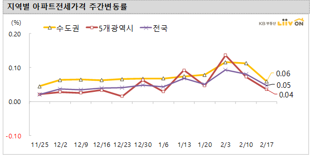 전국 아파트 전세 가격은 전주 대비 0.05% 상승을 기록했으며, 전주 대비 수도권(0.06%)과 5개 광역시(0.04%)는 상승했고, 기타 지방(0.03%)도 상승했습니다.