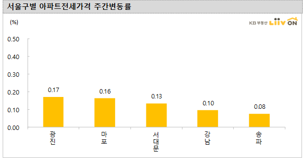 - 서울(0.04%)은 전주 대비 소폭 상승했다. 광진구(0.17%), 마포구(0.16%), 서대문구(0.13%), 강남구(0.10%) 등이 상대적으로 상승하였습니다.